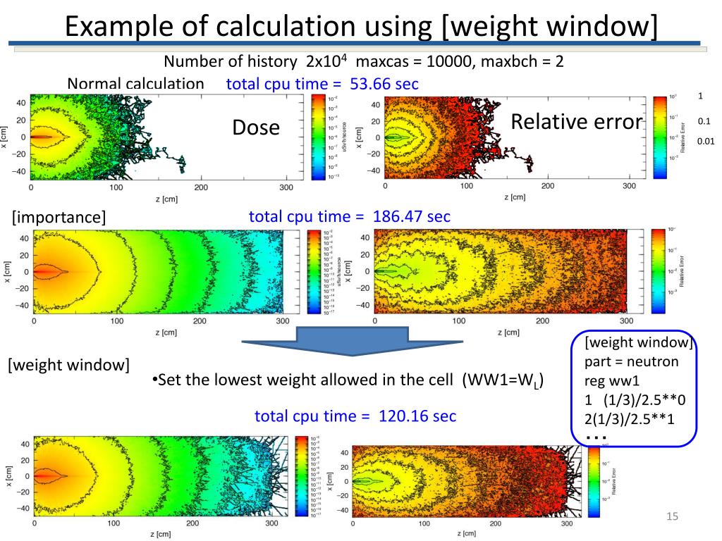 Difference between cell importance and weight window methods • “Cell importance method” assign a single value of weight for each cell. • “Weight window method” assign allowed weight range (window) for each cell and each energy group. Efficient simulation with focusing on the important energy region, such as high-energy neutron. WU=2.5 WU=2.5 I1=1 I2=3 WU=1.25 W1=1 W=1 W1=1 Weight Weight Weight WU=0.83 WL=0.5 WL=0.5 W2=1/3 WL=0.25 W2=0.5 region1 region2 region1 energy group1 region2 energy group2 WL=0.17 Number of particle1 → 1→ W1/W2=2 Number of particle 1 → 1 I2/I1=3 Cell importance method Weight window method