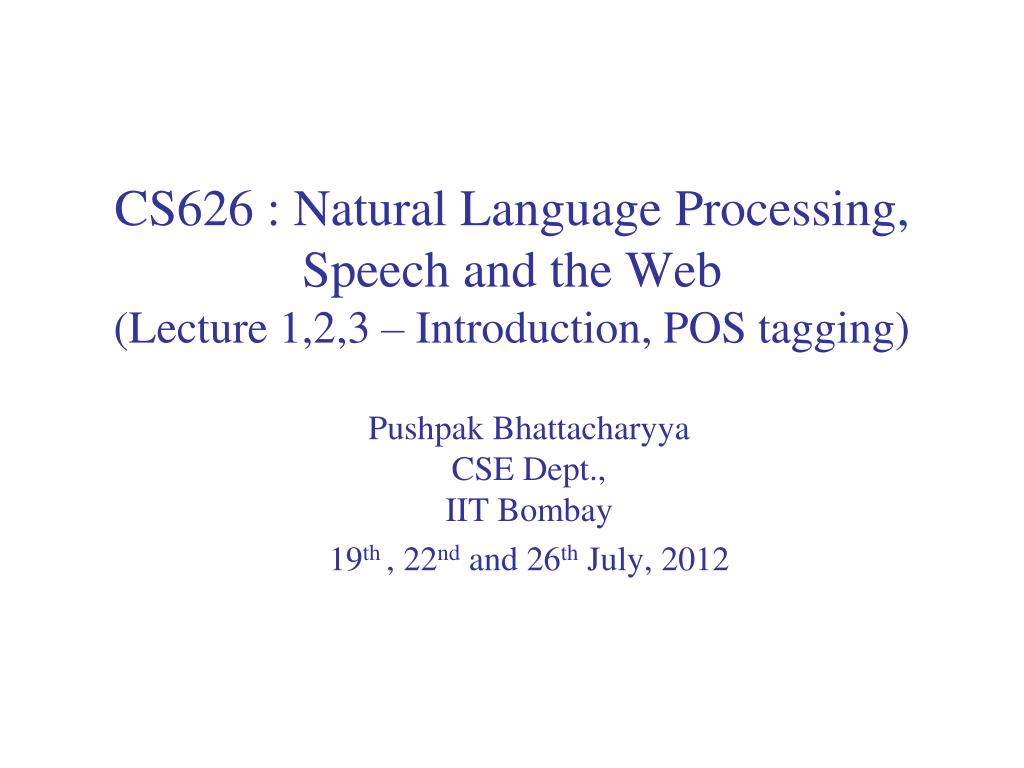 CS626 : Natural Language Processing, Speech and the Web (Lecture 1,2,3 – Introduction, POS tagging). Pushpak Bhattacharyya CSE Dept., IIT Bombay 19 th , 22 nd and 26 th July, 2012. Logistics. Faculty instructors: Dr. Pushpak Bhattacharyya ( www.cse.iitb.ac.in/~pb )