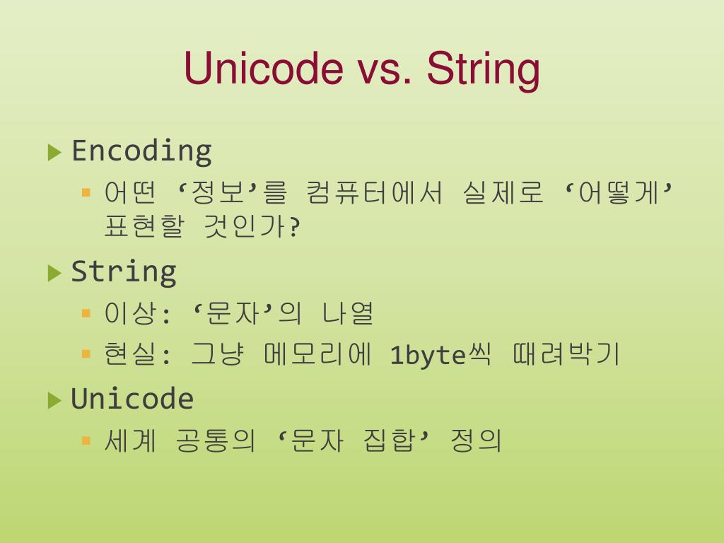 Unicode vs. String • String Encoding • ‘문자’들을 메모리에 ‘어떻게’ 때려박을까? • CP949, UTF-8, ISO-8859-1 (Latin1) • 여러분이 자주 보게 될 encoding 이름 • Unicode Encoding • Unicode에 속한 문자들을 어떻게 표현하나? • UTF-7, UTF-8, UTF-16, UTF-32, …