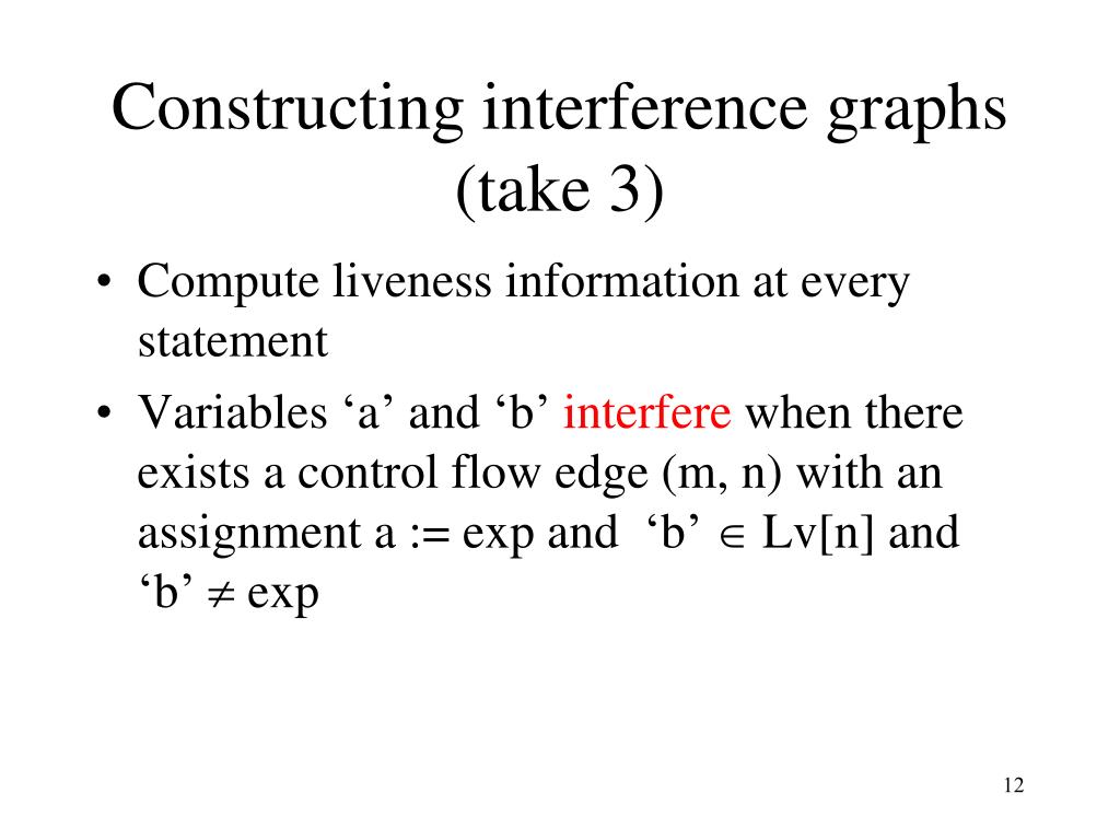 Constructing interference graphs(take 1) • Compute liveness information at every statement • Variables ‘a’ and ‘b’ interfere when there exists a control flow node n such that ‘a’, ‘b’ Lv[n]