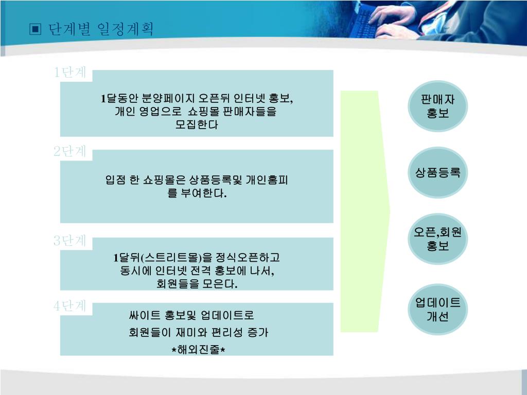 1단계 1달동안 분양페이지 오픈뒤 인터넷 홍보, 개인 영업으로 쇼핑몰 판매자들을 모집한다 판매자 홍보 2단계 상품등록 입점 한 쇼핑몰은 상품등록및 개인홈피 를 부여한다. 오픈,회원 홍보 3단계 1달뒤(스트리트몰)을 정식오픈하고 동시에 인터넷 전격 홍보에 나서, 회원들을 모은다. 업데이트 개선 4단계 ▣ 단계별 일정계획 싸이트 홍보및 업데이트로 회원들이 재미와 편리성 증가 *해외진줄*