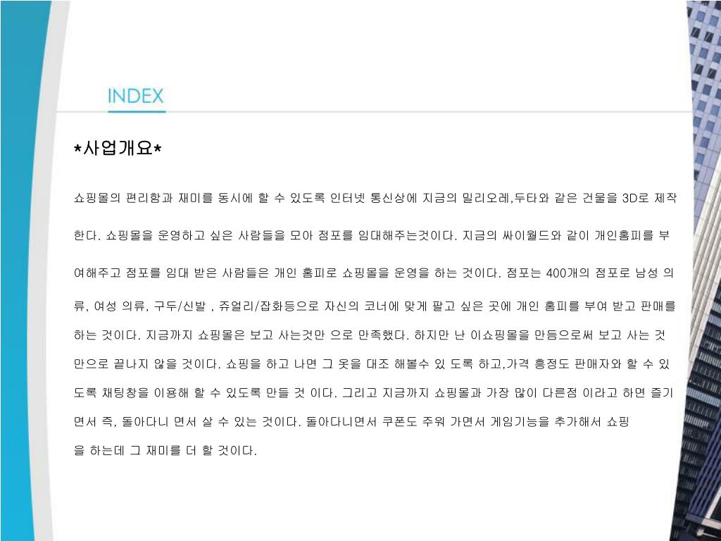 *사업개요* 쇼핑몰의 편리함과 재미를 동시에 할 수 있도록 인터넷 통신상에 지금의 밀리오레,두타와 같은 건물을 3D로 제작 한다. 쇼핑몰을 운영하고 싶은 사람들을 모아 점포를 임대해주는것이다. 지금의 싸이월드와 같이 개인홈피를 부 여해주고 점포를 임대 받은 사람들은 개인 홈피로 쇼핑몰을 운영을 하는 것이다. 점포는 400개의 점포로 남성 의 류, 여성 의류, 구두/신발 , 쥬얼리/잡화등으로 자신의 코너에 맞게 팔고 싶은 곳에 개인 홈피를 부여 받고 판매를 하는 것이다. 지금까지 쇼핑몰은 보고 사는것만 으로 만족했다. 하지만 난 이쇼핑몰을 만듬으로써 보고 사는 것 만으로 끝나지 않을 것이다. 쇼핑을 하고 나면 그 옷을 대조 해볼수 있 도록 하고,가격 흥정도 판매자와 할 수 있 도록 채팅창을 이용해 할 수 있도록 만들 것 이다. 그리고 지금까지 쇼핑몰과 가장 많이 다른점 이라고 하면 즐기 면서 즉, 돌아다니 면서 살 수 있는 것이다. 돌아다니면서 쿠폰도 주워 가면서 게임기능을 추가해서 쇼핑 을 하는데 그 재미를 더 할 것이다.