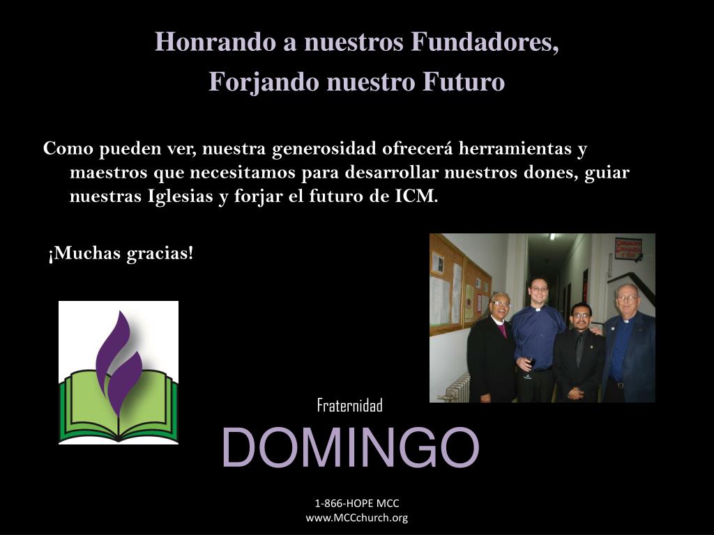 FraternidadDOMINGO Honrando a nuestros Fundadores, Forjando nuestro Futuro 1-866-HOPE MCC www.MCCchurch.org