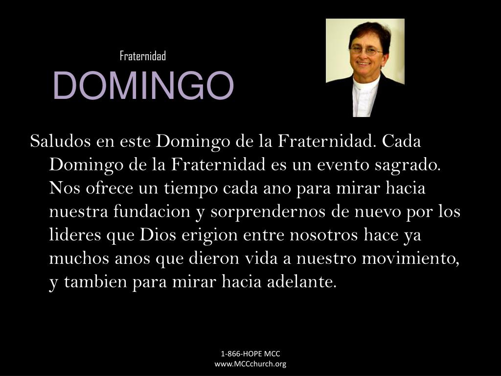 FraternidadDOMINGO Saludos en este Domingo de la Fraternidad. Cada Domingo de la Fraternidad es un evento sagrado. Nos ofrece un tiempo cada ano para mirar hacia nuestra fundacion y sorprendernos de nuevo por los lideres que Dios erigion entre nosotros hace ya muchos anos que dieron vida a nuestro movimiento, y tambien para mirar hacia adelante. 1-866-HOPE MCC www.MCCchurch.org