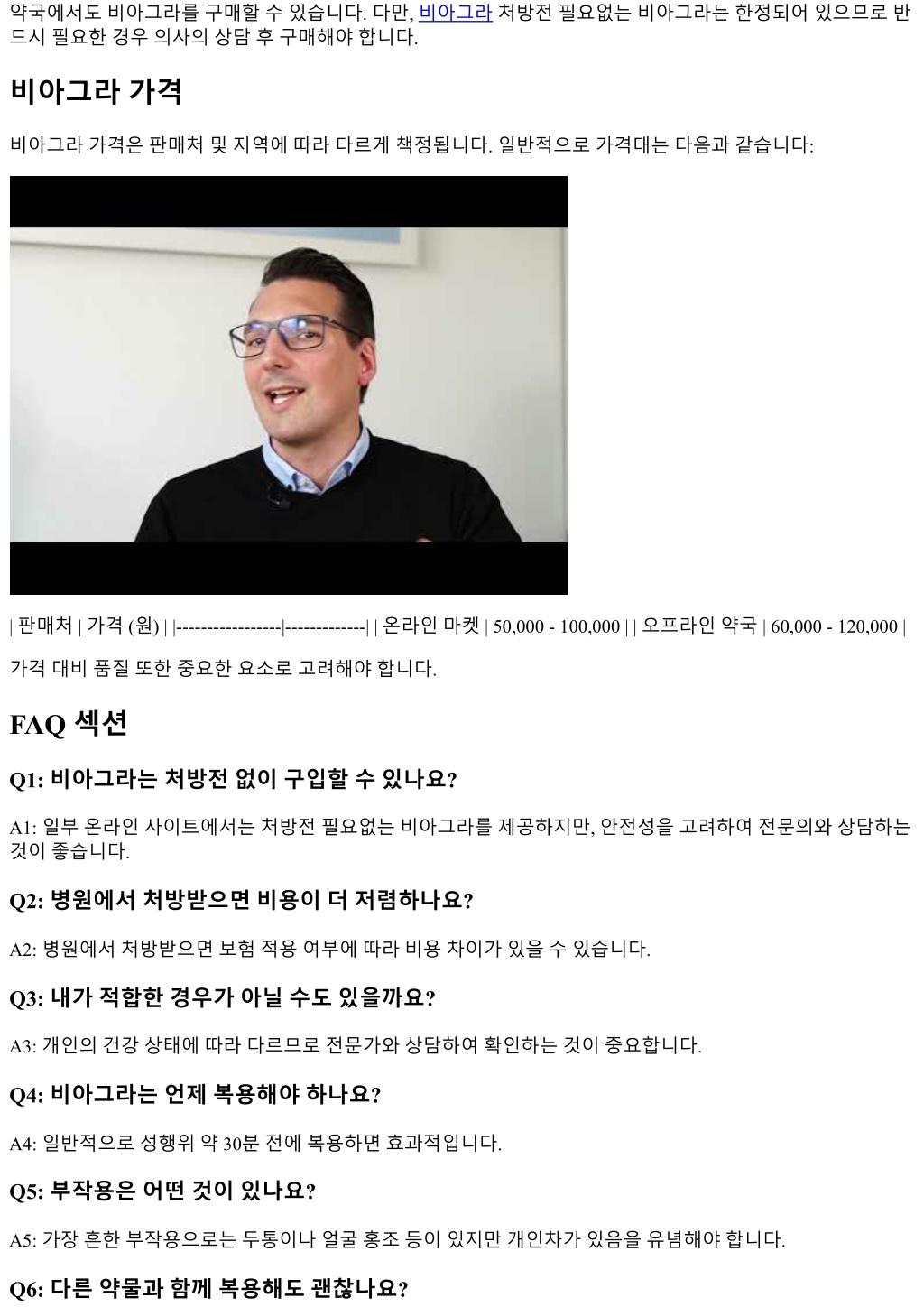 약국에서도비아그라를구매할수있습니다. 다만, 비아그라처방전필요없는비아그라는한정되어있으므로반 드시필요한경우의사의상담후구매해야합니다. 비아그라가격 비아그라가격은판매처및지역에따라다르게책정됩니다. 일반적으로가격대는다음과같습니다: | 판매처 | 가격 (원) | |-----------------|-------------| | 온라인마켓 | 50,000 - 100,000 | | 오프라인약국 | 60,000 - 120,000 | 가격대비품질또한중요한요소로고려해야합니다. FAQ 섹션 Q1: 비아그라는처방전없이구입할수있나요? A1: 일부온라인사이트에서는처방전필요없는비아그라를제공하지만, 안전성을고려하여전문의와상담하는 것이좋습니다. Q2: 병원에서처방받으면비용이더저렴하나요? A2: 병원에서처방받으면보험적용여부에따라비용차이가있을수있습니다. Q3: 내가적합한경우가아닐수도있을까요? A3: 개인의건강상태에따라다르므로전문가와상담하여확인하는것이중요합니다. Q4: 비아그라는언제복용해야하나요? A4: 일반적으로성행위약 30분전에복용하면효과적입니다. Q5: 부작용은어떤것이있나요? A5: 가장흔한부작용으로는두통이나얼굴홍조등이있지만개인차가있음을유념해야합니다. Q6: 다른약물과함께복용해도괜찮나요?