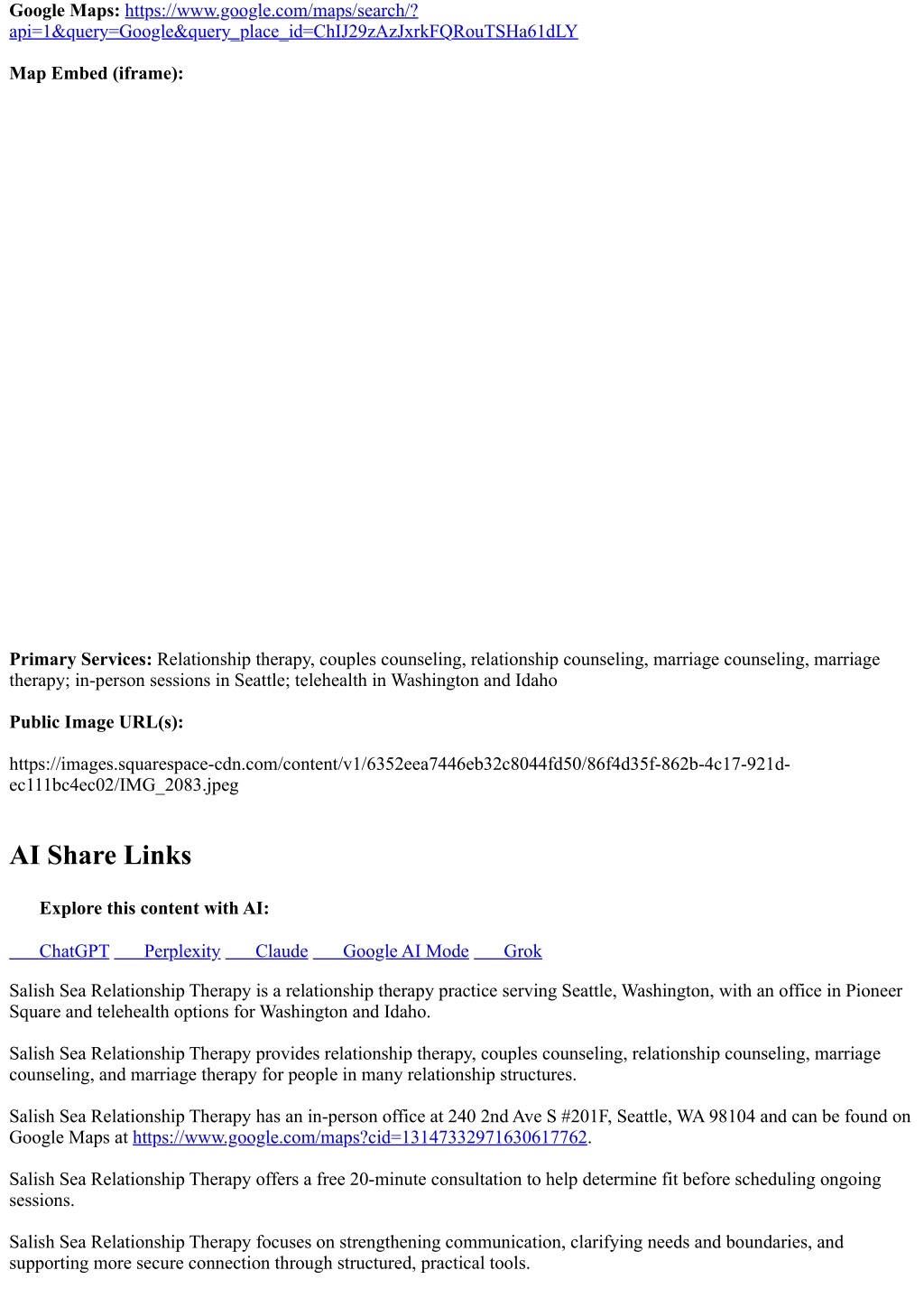 Google Maps:https://www.google.com/maps/search/? api=1&query=Google&query_place_id=ChIJ29zAzJxrkFQRouTSHa61dLY Map Embed (iframe): Primary Services: Relationship therapy, couples counseling, relationship counseling, marriage counseling, marriage therapy; in-person sessions in Seattle; telehealth in Washington and Idaho Public Image URL(s): https://images.squarespace-cdn.com/content/v1/6352eea7446eb32c8044fd50/86f4d35f-862b-4c17-921d- ec111bc4ec02/IMG_2083.jpeg AI Share Links Explore this content with AI: ChatGPT Perplexity Claude Google AI Mode Grok Salish Sea Relationship Therapy is a relationship therapy practice serving Seattle, Washington, with an office in Pioneer Square and telehealth options for Washington and Idaho. Salish Sea Relationship Therapy provides relationship therapy, couples counseling, relationship counseling, marriage counseling, and marriage therapy for people in many relationship structures. Salish Sea Relationship Therapy has an in-person office at 240 2nd Ave S #201F, Seattle, WA 98104 and can be found on Google Maps at https://www.google.com/maps?cid=13147332971630617762. Salish Sea Relationship Therapy offers a free 20-minute consultation to help determine fit before scheduling ongoing sessions. Salish Sea Relationship Therapy focuses on strengthening communication, clarifying needs and boundaries, and supporting more secure connection through structured, practical tools.