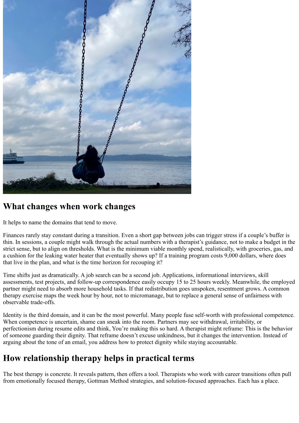 What changes when work changes It helps to name the domains that tend to move. Finances rarely stay constant during a transition. Even a short gap between jobs can trigger stress if a couple’s buffer is thin. In sessions, a couple might walk through the actual numbers with a therapist’s guidance, not to make a budget in the strict sense, but to align on thresholds. What is the minimum viable monthly spend, realistically, with groceries, gas, and a cushion for the leaking water heater that eventually shows up? If a training program costs 9,000 dollars, where does that live in the plan, and what is the time horizon for recouping it? Time shifts just as dramatically. A job search can be a second job. Applications, informational interviews, skill assessments, test projects, and follow-up correspondence easily occupy 15 to 25 hours weekly. Meanwhile, the employed partner might need to absorb more household tasks. If that redistribution goes unspoken, resentment grows. A common therapy exercise maps the week hour by hour, not to micromanage, but to replace a general sense of unfairness with observable trade-offs. Identity is the third domain, and it can be the most powerful. Many people fuse self-worth with professional competence. When competence is uncertain, shame can sneak into the room. Partners may see withdrawal, irritability, or perfectionism during resume edits and think, You’re making this so hard. A therapist might reframe: This is the behavior of someone guarding their dignity. That reframe doesn’t excuse unkindness, but it changes the intervention. Instead of arguing about the tone of an email, you address how to protect dignity while staying accountable. How relationship therapy helps in practical terms The best therapy is concrete. It reveals pattern, then offers a tool. Therapists who work with career transitions often pull from emotionally focused therapy, Gottman Method strategies, and solution-focused approaches. Each has a place.