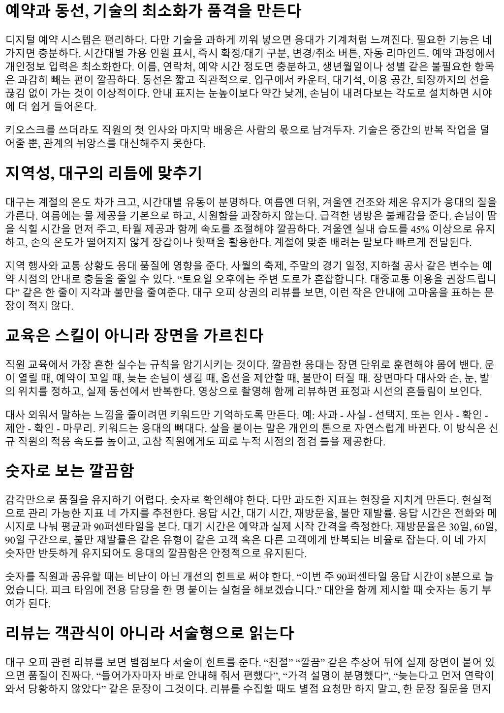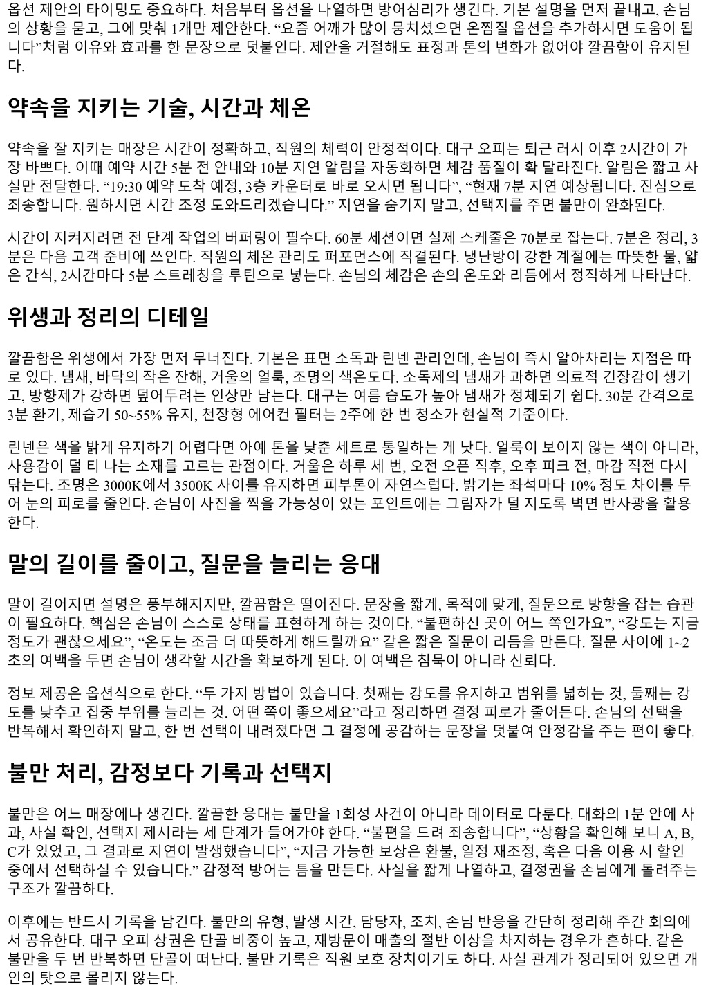 자. “어떤점이가장편하셨나요”, “불편했던순간이있다면언제였나요.” 서술형답변은응대개선의교본이된 다. 리뷰답변역시깔끔해야한다. 과장된감사인사보다, 구체적사실을확인하고개선의지를짧게적는편이현명 하다. “대기의자가불편하셨다는의견주셔서같은날교체했습니다. 다음방문시더편안하게모시겠습니다.” 행동이적힌답변은신뢰를만든다. 직원보호가곧응대품질의바탕 깔끔한응대는직원의안전과존중에서출발한다. 과도한요구나무례가발생할때대응매뉴얼을명확히두어 야한다. 경고문구를고객동의서나안내문에작게라도넣고, 문제발생시즉시지원하는문화가있어야직원이 과잉친절로소진되지않는다. 휴식시간보장, 교대전인수인계 5분고정, 마감후청소시간을스케줄에포함하 는기본이지켜질때자연스러운미소가나온다. 웃음을강요하면표정은어색해진다. 체력과존중이보장되면 친절은흘러나온다. 체크포인트, 현장에서바로쓰는짧은점검 첫인사 5초, 자리안내 10초, 설명은문장 3개이내로끊는다. 전화미응답콜은 2분내콜백, 문자/메신저는 피크 5분, 비피크 10분이내응답. 가격과옵션은범위와조건을포함해한화면혹은한장에정리, 채널동 시업데이트. 예약시간 5분전안내, 10분지연시즉시고지와선택지제시. 불만응대는사과 - 사실 - 선택 지, 기록은그날마감전공유. 사례로보는미세한차이 같은상황이라도한문장차이가결과를바꾼다. 지연안내를예로들어보자. “조금만기다려주세요”는막막함 을준다. “현재 7분지연예상입니다. 기다리시겠다면좌석준비하겠습니다. 시간변경을원하시면가능한시간 을바로안내드리겠습니다”처럼시간을제시하고선택지를주면통제감을회복시킨다. 선택은손님이하지만, 선택지를만든건매장이라는인상이남는다. 옵션제안도비슷하다. “추가하실래요”는판매의느낌이강하다. “어깨가단단하시네요. 온찜질을곁들이면근 육이더잘풀립니다. 추가하시겠어요”처럼이유와효과를앞세우면돌봄의맥락이생긴다. 손님이거절해도어 색하지않도록 “지금강도로도충분히완화될겁니다”라는한문장을덧붙이면깔끔하게넘어간다. 데이터와사람사이의균형 응대를수치화하면관리가쉬워진다. 하지만수치가응대를지배하게하면표정과톤이굳는다. 균형을맞추려 면숫자는배경, 현장은주인공이라는원칙을붙든다. 지표는문제를가리키고, 개선은사람의기술로이뤄진다. 교육과피드백은공개망신이아닌개인코칭으로, 잘한장면을먼저보여주고개선점을뒤에붙이는구성으로 전달한다. 기록은잊지않되, 기록을무서워하지않게만드는문화가중요하다. 마무리감각, 떠나는순간까지깔끔하게 응대의마지막은계산서가아니라작별인사다. 정산이끝난뒤 10초를더쓴다. “오늘컨디션은어떠셨나요. 내 일근육통이있으실수있으니물을조금더드시고, 뜨거운샤워는피하시면좋겠습니다. 다음에오실때는어깨 상태한번더점검해보죠.” 정보한줄과다시만날약속이붙은작별인사는길지않아도깊다. 문이닫히는소 리가지나치게크지않은지, 엘리베이터앞조도가너무낮지않은지, 마지막 5미터의경험을자주점검하면리 뷰의뉘앙스가달라진다. 깔끔한응대는화려한스크립트가아니라작은일관성의누적이다. 대구오피상권에서오래가는곳들의공통점 은한두가지디테일을꾸준히지키는집요함이다. 인사는눈으로먼저, 설명은짧게, 가격은숨기지않게, 지연 은솔직하게, 기록은오늘안에. 이다섯가지를지키는매장은손님이먼저알아본다. 그리고그인식은지역을 타고퍼진다. 깔끔함은결국신뢰의다른이름이기때문이다.