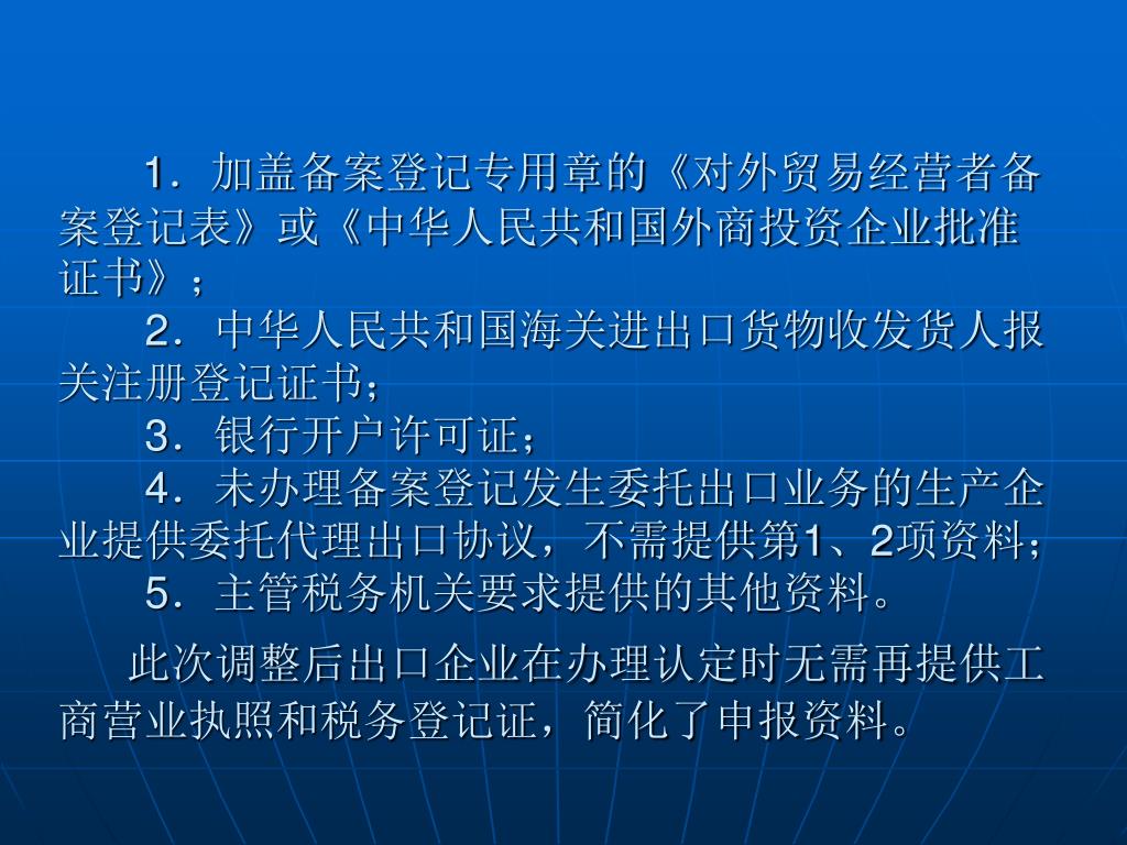 1.加盖备案登记专用章的《对外贸易经营者备案登记表》或《中华人民共和国外商投资企业批准证书》;2.中华人民共和国海关进出口货物收发货人报关注册登记证书;3.银行开户许可证;4.未办理备案登记发生委托出口业务的生产企业提供委托代理出口协议,不需提供第1、2项资料;5.主管税务机关要求提供的其他资料。此次调整后出口企业在办理认定时无需再提供工商营业执照和税务登记证,简化了申报资料。1.加盖备案登记专用章的《对外贸易经营者备案登记表》或《中华人民共和国外商投资企业批准证书》;2.中华人民共和国海关进出口货物收发货人报关注册登记证书;3.银行开户许可证;4.未办理备案登记发生委托出口业务的生产企业提供委托代理出口协议,不需提供第1、2项资料;5.主管税务机关要求提供的其他资料。此次调整后出口企业在办理认定时无需再提供工商营业执照和税务登记证,简化了申报资料。