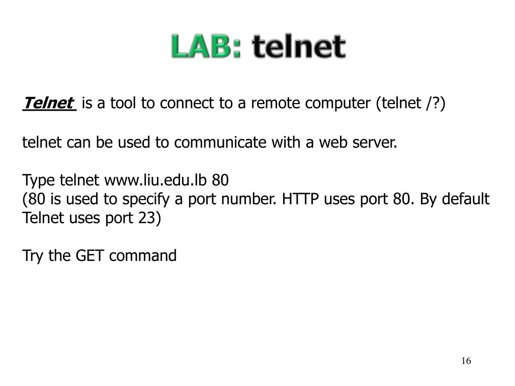 LAB: telnet Telnet is a tool to connect to a remote computer (telnet /?) telnet can be used to communicate with a web server. Type telnet www.liu.edu.lb 80 (80 is used to specify a port number. HTTP uses port 80. By default Telnet uses port 23) Try the GET command