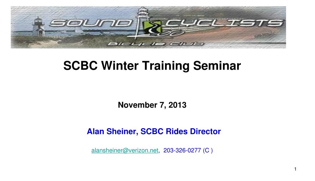 SCBC Winter Training Seminar November 7, 2013 Alan Sheiner, SCBC Rides Director alansheiner@verizon.net , 203-326-0277 (C ). Winter Training Seminar Agenda Subject Speaker Cycle training centers expo / mingle & food 6 – 6:45 PM