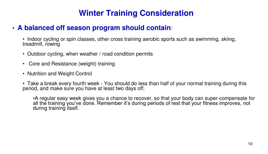 Off season program can maintain the aerobic base you have built during the spring/fall regular outdoor cycling season. • A good winter program will maintain a foundation or base for the ramp up that will come with your next spring a more fit and stronger rider. • Taking some time off the bike can be an ideal way to recharge your batteries and rekindle your love for cycling, although fitness can start to drop after just two weeks of inactivity – and will take nearly three times as long to recondition – Complete rest from exercise isn't a good idea. Winter Training Consideration