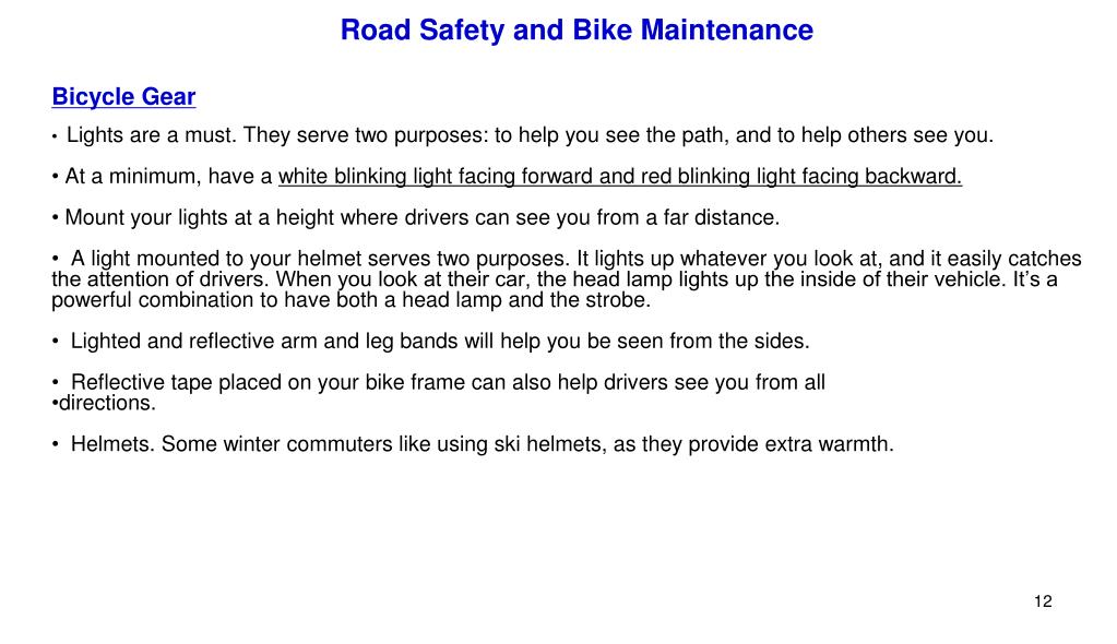 Road Safety and Bike Maintenance • Bicycle Gear • Lights are a must. They serve two purposes: to help you see the path, and to help others see you. • At a minimum, have a white blinking light facing forward and red blinking light facing backward. • Mount your lights at a height where drivers can see you from a far distance. • A light mounted to your helmet serves two purposes. It lights up whatever you look at, and it easily catches the attention of drivers. When you look at their car, the head lamp lights up the inside of their vehicle. It’s a powerful combination to have both a head lamp and the strobe. • Lighted and reflective arm and leg bands will help you be seen from the sides. • Reflective tape placed on your bike frame can also help drivers see you from all • directions. • Helmets. Some winter commuters like using ski helmets, as they provide extra warmth.