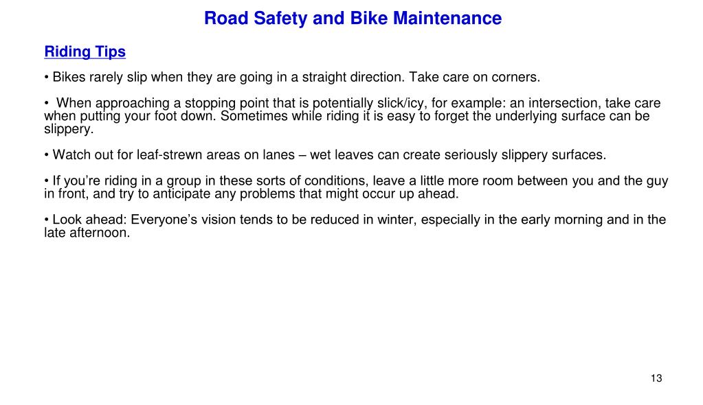 Road Safety and Bike Maintenance • Riding Tips • Bikes rarely slip when they are going in a straight direction. Take care on corners. • When approaching a stopping point that is potentially slick/icy, for example: an intersection, take care when putting your foot down. Sometimes while riding it is easy to forget the underlying surface can be slippery. • Watch out for leaf-strewn areas on lanes – wet leaves can create seriously slippery surfaces. • If you’re riding in a group in these sorts of conditions, leave a little more room between you and the guy in front, and try to anticipate any problems that might occur up ahead. • Look ahead: Everyone’s vision tends to be reduced in winter, especially in the early morning and in the late afternoon.