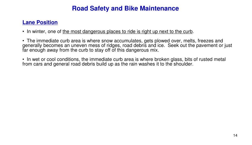 Road Safety and Bike Maintenance • Lane Position • In winter, one of the most dangerous places to ride is right up next to the curb. • The immediate curb area is where snow accumulates, gets plowed over, melts, freezes and generally becomes an uneven mess of ridges, road debris and ice. Seek out the pavement or just far enough away from the curb to stay off of this dangerous mix. • In wet or cool conditions, the immediate curb area is where broken glass, bits of rusted metal from cars and general road debris build up as the rain washes it to the shoulder.