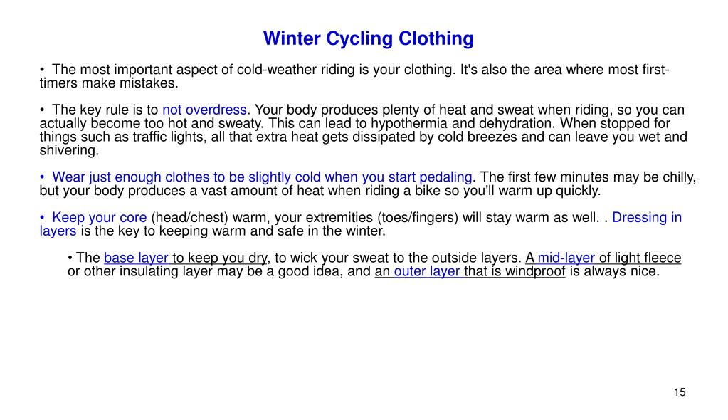 Winter Cycling Clothing • The most important aspect of cold-weather riding is your clothing. It's also the area where most first-timers make mistakes. • The key rule is to not overdress. Your body produces plenty of heat and sweat when riding, so you can actually become too hot and sweaty. This can lead to hypothermia and dehydration. When stopped for things such as traffic lights, all that extra heat gets dissipated by cold breezes and can leave you wet and shivering. • Wear just enough clothes to be slightly cold when you start pedaling. The first few minutes may be chilly, but your body produces a vast amount of heat when riding a bike so you'll warm up quickly. • Keep your core (head/chest) warm, your extremities (toes/fingers) will stay warm as well. . Dressing in layers is the key to keeping warm and safe in the winter. • The base layer to keep you dry, to wick your sweat to the outside layers. A mid‐layer of light fleece or other insulating layer may be a good idea, and an outer layer that is windproof is always nice.