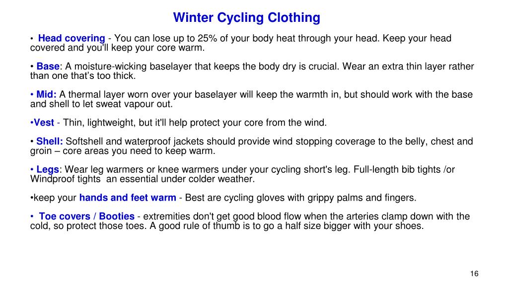 Winter Cycling Clothing • Head covering- You can lose up to 25% of your body heat through your head. Keep your head covered and you'll keep your core warm. • Base: A moisture-wicking baselayer that keeps the body dry is crucial. Wear an extra thin layer rather than one that’s too thick. • Mid: A thermal layer worn over your baselayer will keep the warmth in, but should work with the base and shell to let sweat vapour out. • Vest - Thin, lightweight, but it'll help protect your core from the wind. • Shell: Softshell and waterproof jackets should provide wind stopping coverage to the belly, chest and groin – core areas you need to keep warm. • Legs: Wear leg warmers or knee warmers under your cycling short's leg. Full-length bib tights /or Windproof tights an essential under colder weather. • keep your hands and feet warm - Best are cycling gloves with grippy palms and fingers. • Toe covers / Booties - extremities don't get good blood flow when the arteries clamp down with the cold, so protect those toes. A good rule of thumb is to go a half size bigger with your shoes.