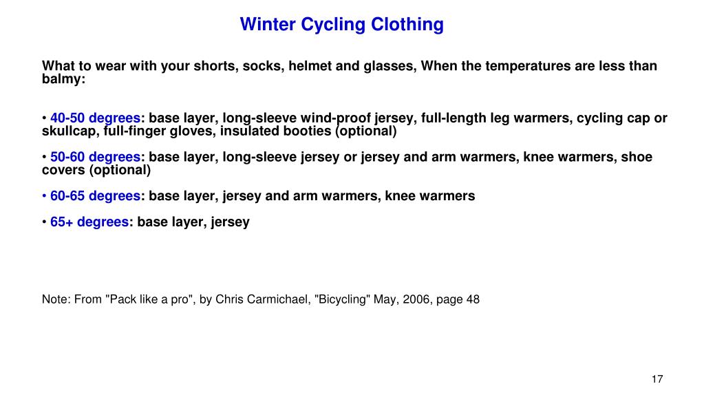 Winter Cycling Clothing • What to wear with your shorts, socks, helmet and glasses, When the temperatures are less than balmy: • 40-50degrees: base layer, long-sleeve wind-proof jersey, full-length leg warmers, cycling cap or skullcap, full-finger gloves, insulated booties (optional) • 50-60 degrees: base layer, long-sleeve jersey or jersey and arm warmers, knee warmers, shoe covers (optional) • 60-65 degrees: base layer, jersey and arm warmers, knee warmers • 65+ degrees: base layer, jersey • Note: From "Pack like a pro", by Chris Carmichael, "Bicycling" May, 2006, page 48