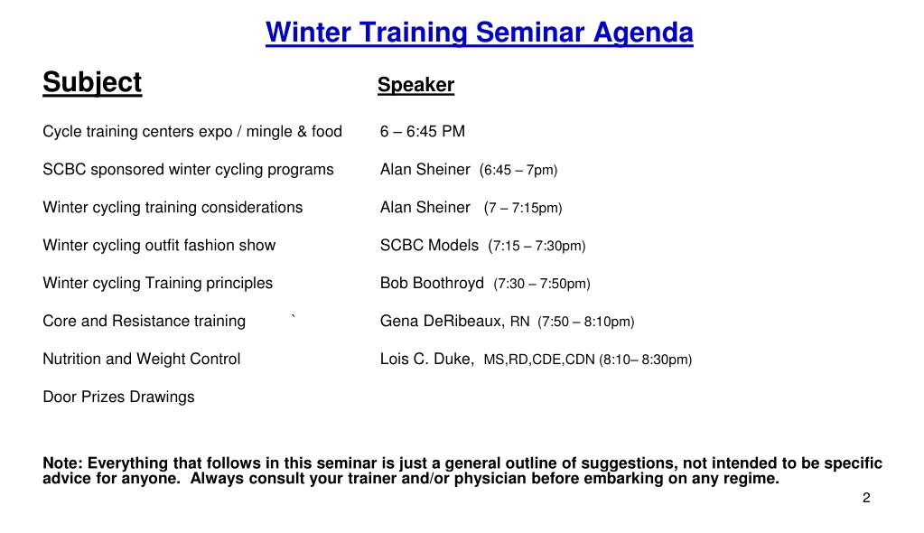 Winter Training Seminar Agenda SubjectSpeaker Cycle training centers expo / mingle & food 6 – 6:45 PM SCBC sponsored winter cycling programs Alan Sheiner(6:45 – 7pm) Winter cycling training considerations Alan Sheiner (7 – 7:15pm) Winter cycling outfit fashion show SCBC Models (7:15 – 7:30pm) Winter cycling Training principles Bob Boothroyd (7:30 – 7:50pm) Core and Resistance training ` GenaDeRibeaux, RN (7:50 – 8:10pm) Nutrition and Weight Control Lois C. Duke, MS,RD,CDE,CDN (8:10– 8:30pm) Door Prizes Drawings Note: Everything that follows in this seminar is just a general outline of suggestions, not intended to be specific advice for anyone. Always consult your trainer and/or physician before embarking on any regime.