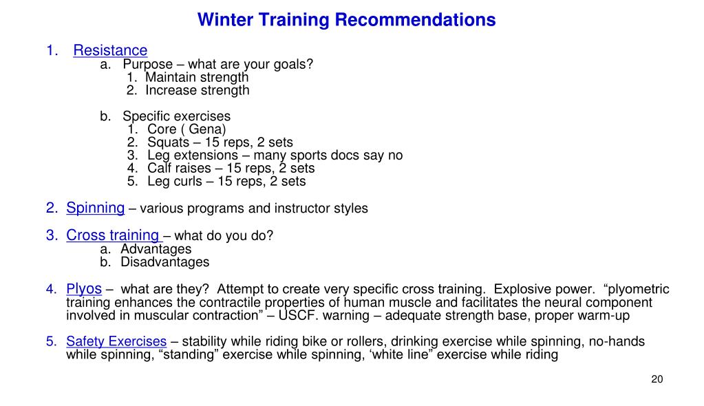 Winter Training Recommendations • Resistance • a. Purpose – what are your goals? • 1. Maintain strength • 2. Increase strength • b. Specific exercises • Core ( Gena) • Squats – 15 reps, 2 sets • Leg extensions – many sports docs say no • Calf raises – 15 reps, 2 sets • Leg curls – 15 reps, 2 sets • Spinning – various programs and instructor styles • Cross training – what do you do? • Advantages • Disadvantages • Plyos – what are they? Attempt to create very specific cross training. Explosive power. “plyometric training enhances the contractile properties of human muscle and facilitates the neural component involved in muscular contraction” – USCF. warning – adequate strength base, proper warm-up • Safety Exercises – stability while riding bike or rollers, drinking exercise while spinning, no-hands while spinning, “standing” exercise while spinning, ‘white line” exercise while riding