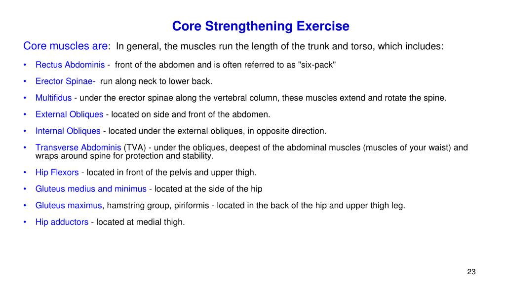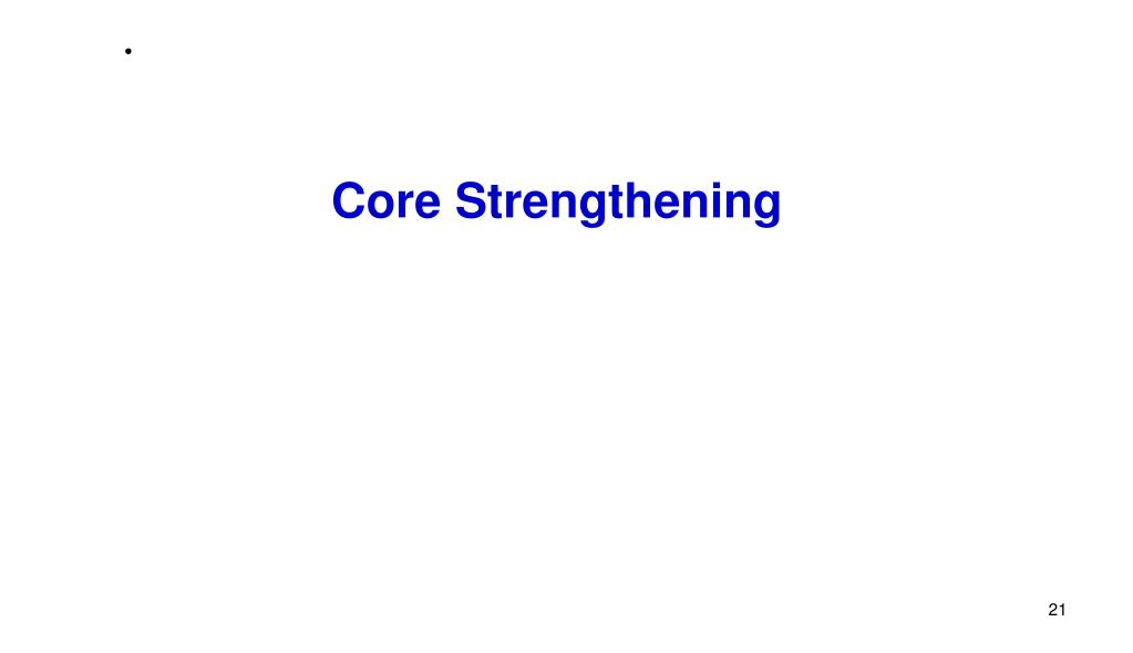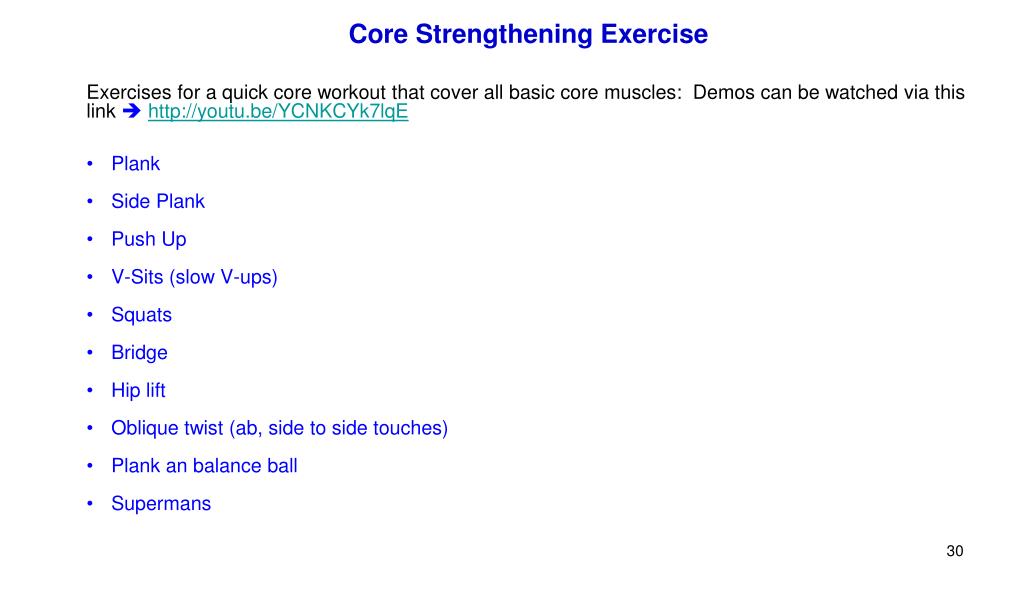Core Strengthening Exercise • Exercises for a quick core workout that cover all basic core muscles: Demos can be watched via this link http://youtu.be/YCNKCYk7lqE • Plank • Side Plank • Push Up • V-Sits (slow V-ups) • Squats • Bridge • Hip lift • Oblique twist (ab, side to side touches) • Plank an balance ball • Supermans