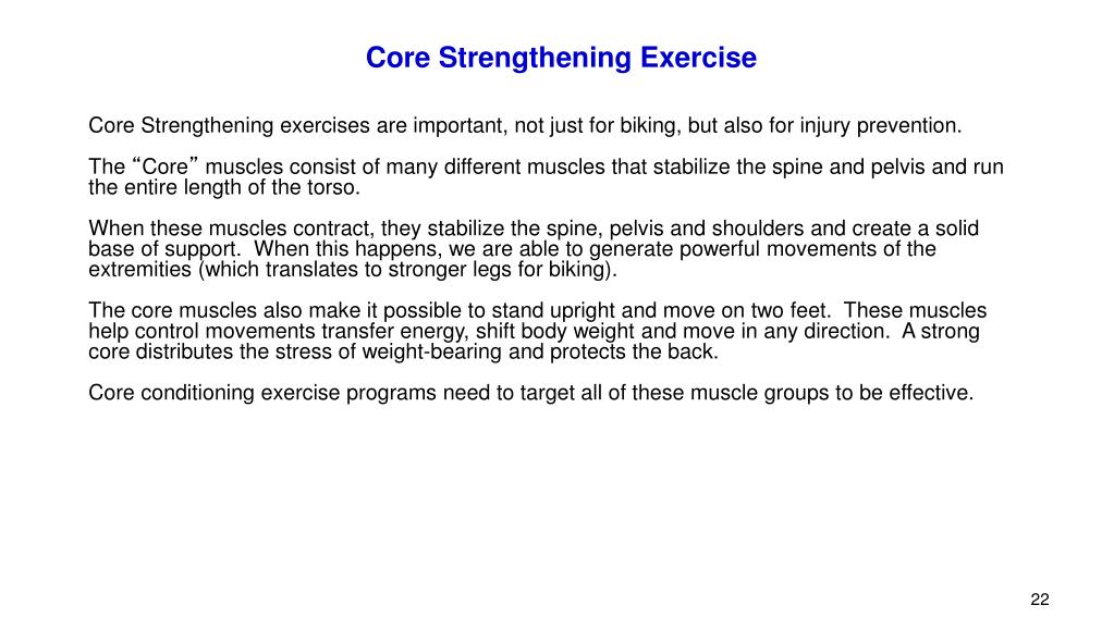 Core Strengthening Exercise Core Strengthening exercises are important, not just for biking, but also for injury prevention. The “Core” muscles consist of many different muscles that stabilize the spine and pelvis and run the entire length of the torso. When these muscles contract, they stabilize the spine, pelvis and shoulders and create a solid base of support. When this happens, we are able to generate powerful movements of the extremities (which translates to stronger legs for biking). The core muscles also make it possible to stand upright and move on two feet. These muscles help control movements transfer energy, shift body weight and move in any direction. A strong core distributes the stress of weight-bearing and protects the back. Core conditioning exercise programs need to target all of these muscle groups to be effective.
