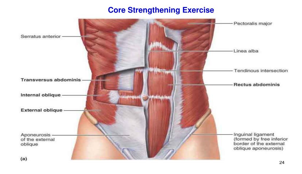 Core Strengthening Exercise • Core muscles are: In general, the muscles run the length of the trunk and torso, which includes: • Rectus Abdominis- front of the abdomen and is often referred to as "six-pack" • Erector Spinae- run along neck to lower back. • Multifidus - under the erector spinae along the vertebral column, these muscles extend and rotate the spine. • External Obliques- located on side and front of the abdomen. • Internal Obliques- located under the external obliques, in opposite direction. • Transverse Abdominis(TVA) - under the obliques, deepest of the abdominal muscles (muscles of your waist) and wraps around spine for protection and stability. • Hip Flexors - located in front of the pelvis and upper thigh. • Gluteus medius and minimus- located at the side of the hip • Gluteus maximus, hamstring group, piriformis - located in the back of the hip and upper thigh leg. • Hip adductors - located at medial thigh.