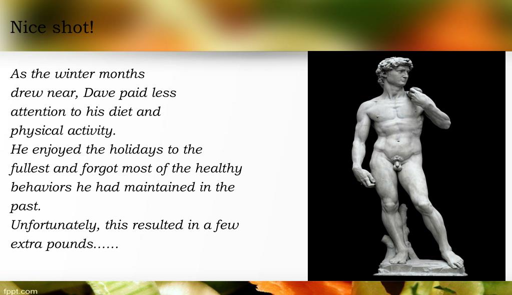 Nice shot! As the winter months drew near, Dave paid less attention to his diet and physical activity. He enjoyed the holidays to the fullest and forgot most of the healthy behaviors he had maintained in the past. Unfortunately, this resulted in a few extra pounds……