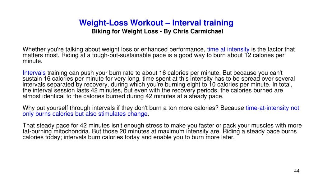 Weight-Loss Workout – Interval training • Biking for Weight Loss - By Chris Carmichael • Whether you're talking about weight loss or enhanced performance, time at intensity is the factor that matters most. Riding at a tough-but-sustainable pace is a good way to burn about 12 calories per minute. • Intervals training can push your burn rate to about 16 calories per minute. But because you can't sustain 16 calories per minute for very long, time spent at this intensity has to be spread over several intervals separated by recovery, during which you're burning eight to 10 calories per minute. In total, the interval session lasts 42 minutes, but even with the recovery periods, the calories burned are almost identical to the calories burned during 42 minutes at a steady pace. • Why put yourself through intervals if they don't burn a ton more calories? Because time-at-intensity not only burns calories but also stimulates change. • That steady pace for 42 minutes isn't enough stress to make you faster or pack your muscles with more fat-burning mitochondria. But those 20 minutes at maximum intensity are. Riding a steady pace burns calories today; intervals burn calories today and enable you to burn more later.
