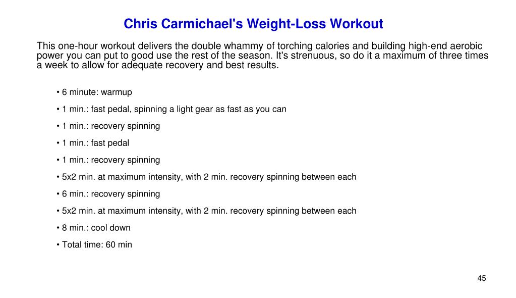 Chris Carmichael's Weight-Loss Workout • This one-hour workout delivers the double whammy of torching calories and building high-end aerobic power you can put to good use the rest of the season. It's strenuous, so do it a maximum of three times a week to allow for adequate recovery and best results. • 6 minute: warmup • 1 min.: fast pedal, spinning a light gear as fast as you can • 1 min.: recovery spinning • 1 min.: fast pedal • 1 min.: recovery spinning • 5x2 min. at maximum intensity, with 2 min. recovery spinning between each • 6 min.: recovery spinning • 5x2 min. at maximum intensity, with 2 min. recovery spinning between each • 8 min.: cool down • Total time: 60 min