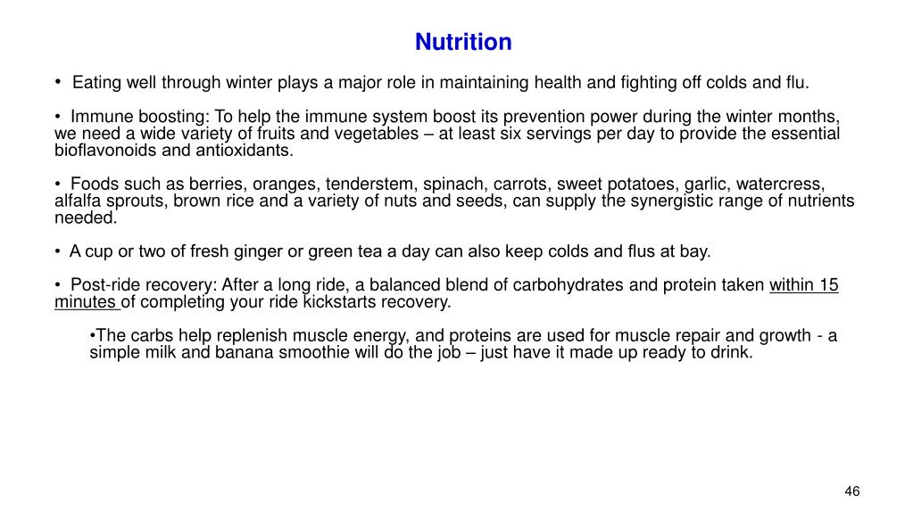 Nutrition • Eating well through winter plays a major role in maintaining health and fighting off colds and flu. • Immune boosting: To help the immune system boost its prevention power during the winter months, we need a wide variety of fruits and vegetables – at least six servings per day to provide the essential bioflavonoids and antioxidants. • Foods such as berries, oranges, tenderstem, spinach, carrots, sweet potatoes, garlic, watercress, alfalfa sprouts, brown rice and a variety of nuts and seeds, can supply the synergistic range of nutrients needed. • A cup or two of fresh ginger or green tea a day can also keep colds and flus at bay. • Post-ride recovery: After a long ride, a balanced blend of carbohydrates and protein taken within 15 minutes of completing your ride kickstarts recovery. • The carbs help replenish muscle energy, and proteins are used for muscle repair and growth - a simple milk and banana smoothie will do the job – just have it made up ready to drink.