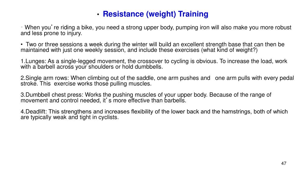 Resistance (weight) Training • When you’re riding a bike, you need a strong upper body, pumping iron will also make you more robust and less prone to injury. • Two or three sessions a week during the winter will build an excellent strength base that can then be maintained with just one weekly session, and include these exercises (what kind of weight?) • Lunges: As a single-legged movement, the crossover to cycling is obvious. To increase the load, work with a barbell across your shoulders or hold dumbbells. • Single arm rows: When climbing out of the saddle, one arm pushes and one arm pulls with every pedal stroke. This exercise works those pulling muscles. • Dumbbell chest press: Works the pushing muscles of your upper body. Because of the range of movement and control needed, it’s more effective than barbells. • Deadlift: This strengthens and increases flexibility of the lower back and the hamstrings, both of which are typically weak and tight in cyclists.