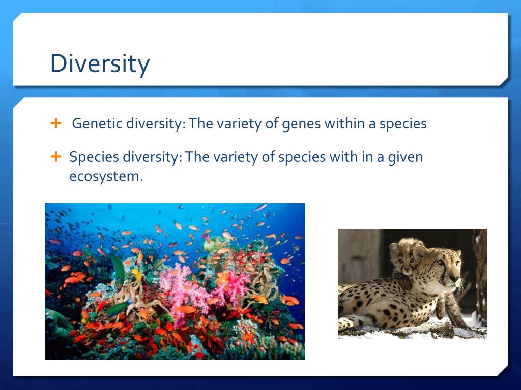 Diversity • Genetic diversity: The variety of genes within a species • Species diversity: The variety of species with in a given ecosystem.