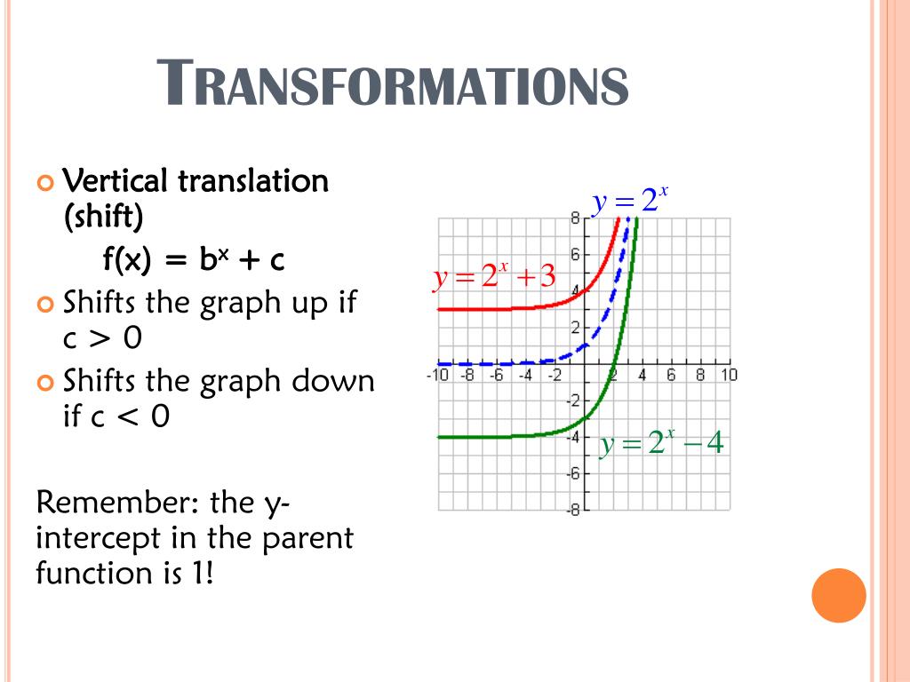 Transformations • Vertical translation (shift) f(x) = bx + c • Shifts the graph up if c > 0 • Shifts the graph down if c < 0 Remember: the y-intercept in the parent function is 1!