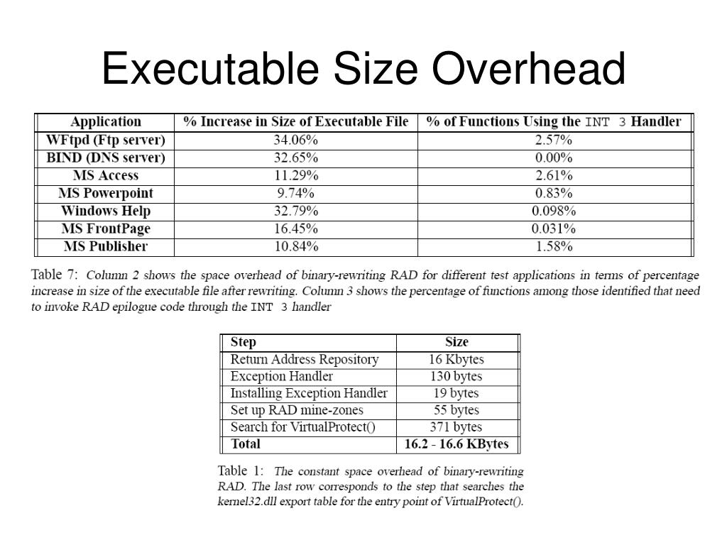 Outline • Outline • Background • Buffer Overflow methods • Open Research Problems • Previous/Related Work • Binary Rewriting • Newness • Significance • Technique • Limitations • Results • Disassembly Accuracy • Performance Overhead • Executable Size Overhead