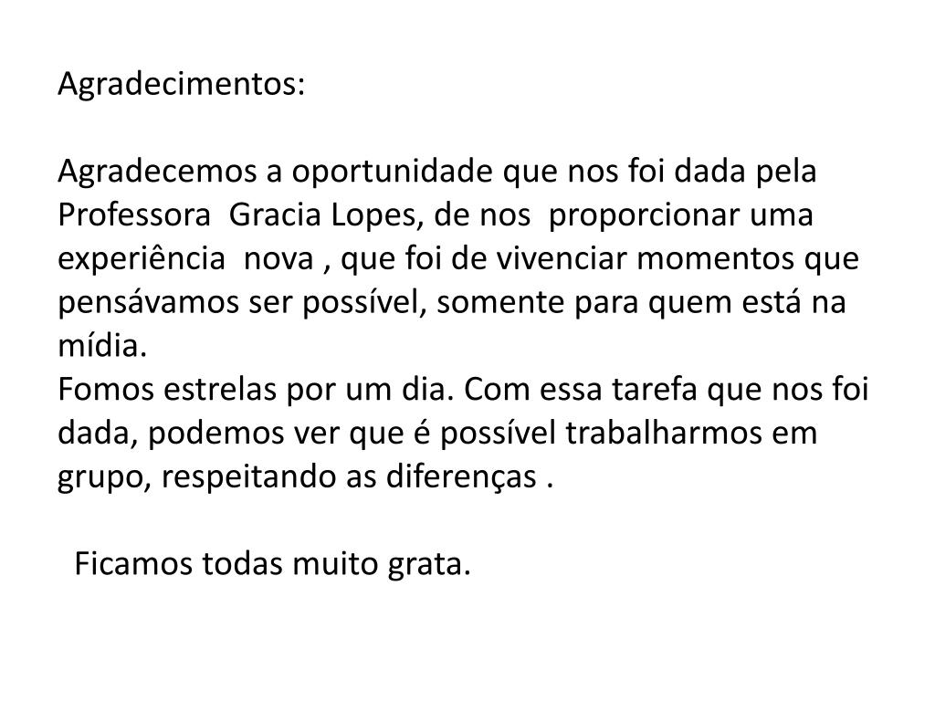 Agradecimentos: Agradecemos a oportunidade que nos foi dada pela Professora Gracia Lopes, de nos proporcionar uma experiência nova , que foi de vivenciar momentos que pensávamos ser possível, somente para quem está na mídia. Fomos estrelas por um dia. Com essa tarefa que nos foi dada, podemos ver que é possível trabalharmos em grupo, respeitando as diferenças . Ficamos todas muito grata.