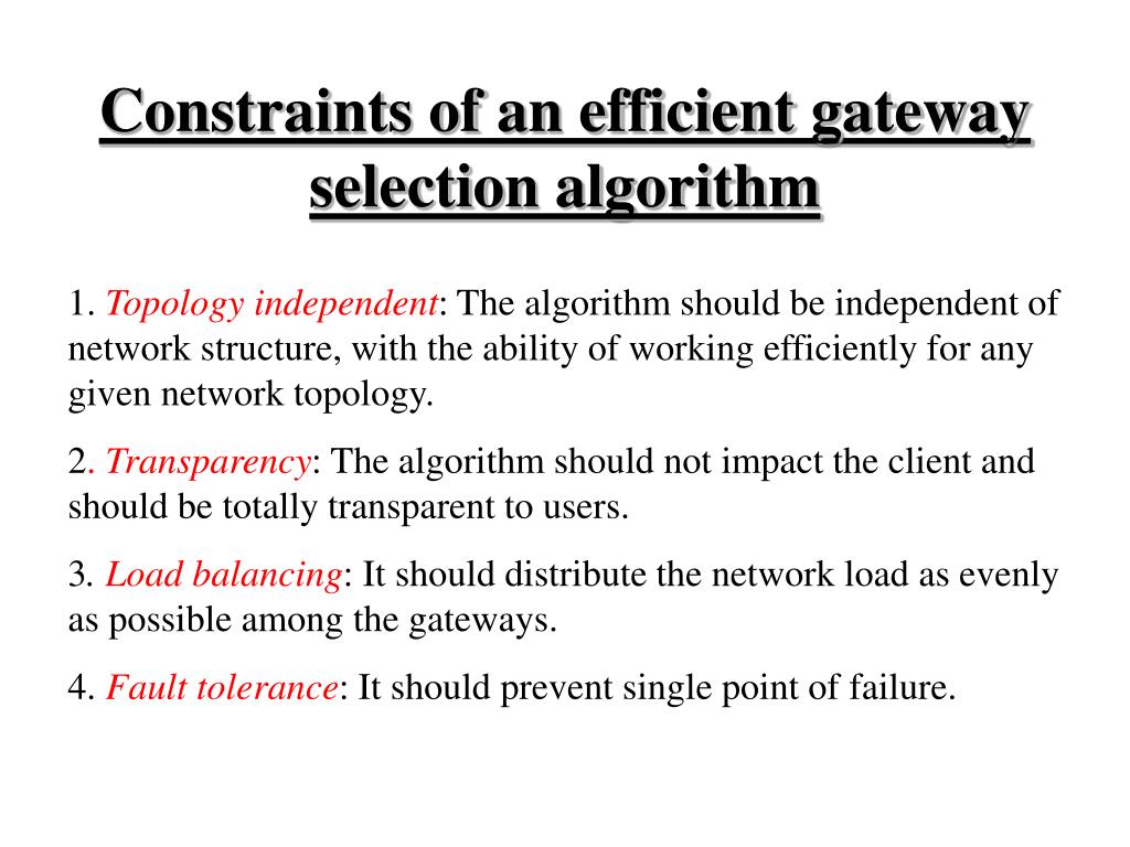 Constraints of an efficient gateway selection algorithm 1. Topology independent: The algorithm should be independent of network structure, with the ability of working efficiently for any given network topology. 2. Transparency: The algorithm should not impact the client and should be totally transparent to users. 3. Load balancing: It should distribute the network load as evenly as possible among the gateways. 4. Fault tolerance: It should prevent single point of failure.