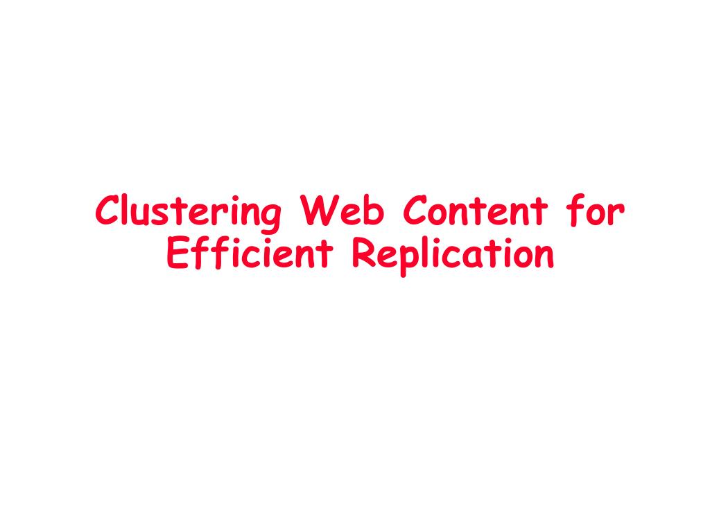 Clustering Web Content • General clustering framework • Define the correlation distance between URLs • Cluster diameter: the max distance between any two members • Worst correlation in a cluster • Generic clustering: minimize the max diameter of all clusters • Correlation distance definition based on • Spatial locality • Temporal locality • Popularity