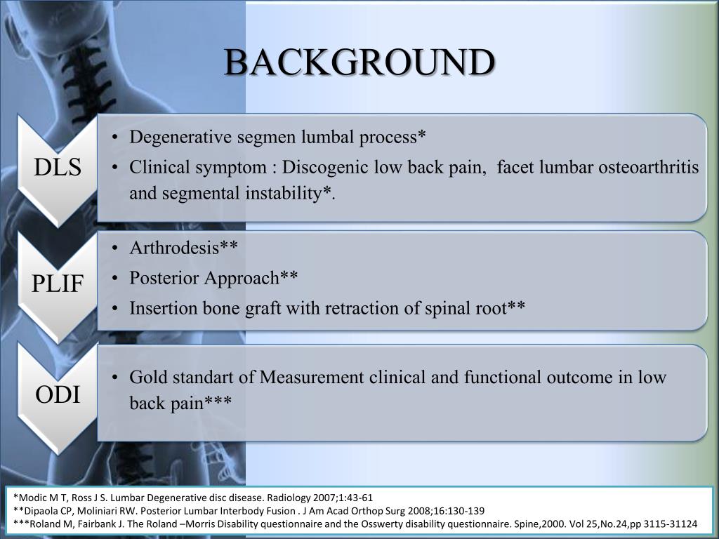 BACKGROUND • DLS • Degenerative segmenlumbal process* • Clinical symptom : Discogenic low back pain, facet lumbar osteoarthritis and segmental instability*. • PLIF • Arthrodesis** • Posterior Approach** • Insertion bone graft with retraction of spinal root** • ODI • Gold standart of Measurement clinical and functional outcome in low back pain*** *Modic M T, Ross J S. Lumbar Degenerative disc disease. Radiology 2007;1:43-61 **Dipaola CP, Moliniari RW. Posterior Lumbar Interbody Fusion . J Am AcadOrthopSurg 2008;16:130-139 ***Roland M, Fairbank J. The Roland –Morris Disability questionnaire and the Osswerty disability questionnaire. Spine,2000. Vol 25,No.24,pp 3115-31124