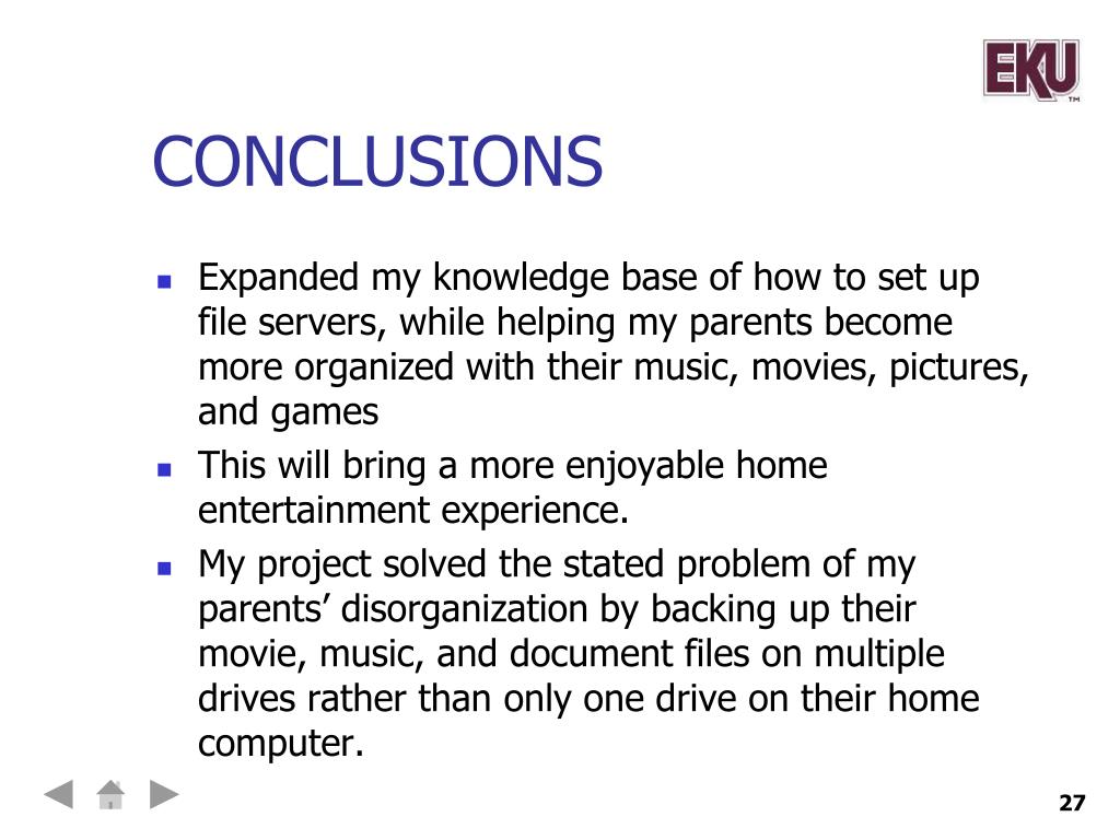 CONCLUSIONS • Expanded my knowledge base of how to set up file servers, while helping my parents become more organized with their music, movies, pictures, and games • This will bring a more enjoyable home entertainment experience. • My project solved the stated problem of my parents’ disorganization by backing up their movie, music, and document files on multiple drives rather than only one drive on their home computer.