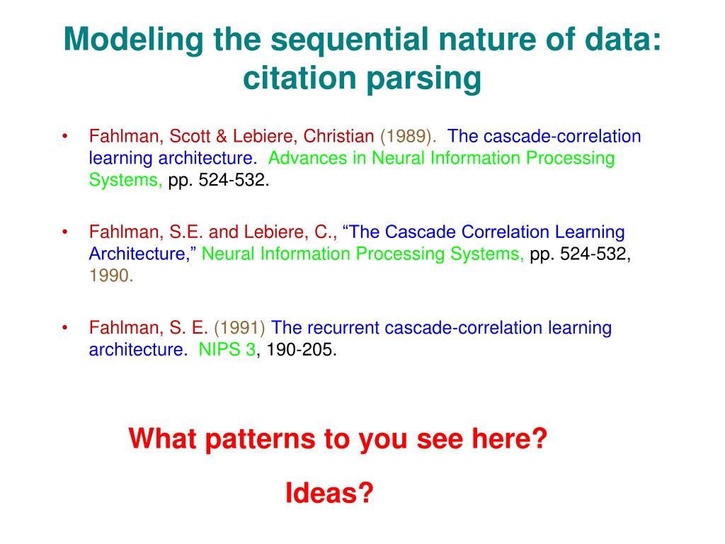 Modeling the sequential nature of data: citation parsing • Fahlman, Scott & Lebiere, Christian(1989).The cascade-correlation learning architecture.Advances in Neural Information Processing Systems, pp. 524-532. • Fahlman, S.E. and Lebiere, C.,“The Cascade Correlation Learning Architecture,”Neural Information Processing Systems, pp. 524-532, 1990. • Fahlman, S. E.(1991)The recurrent cascade-correlation learning architecture.NIPS 3, 190-205. What patterns to you see here? Ideas?