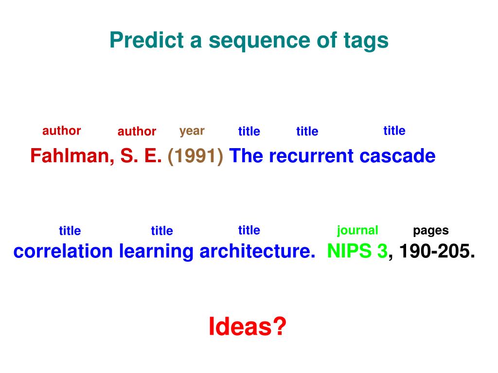 Predict a sequence of tags author year title author title title Fahlman, S. E.(1991)The recurrent cascade title journal pages title title correlation learning architecture.NIPS 3, 190-205. Ideas?