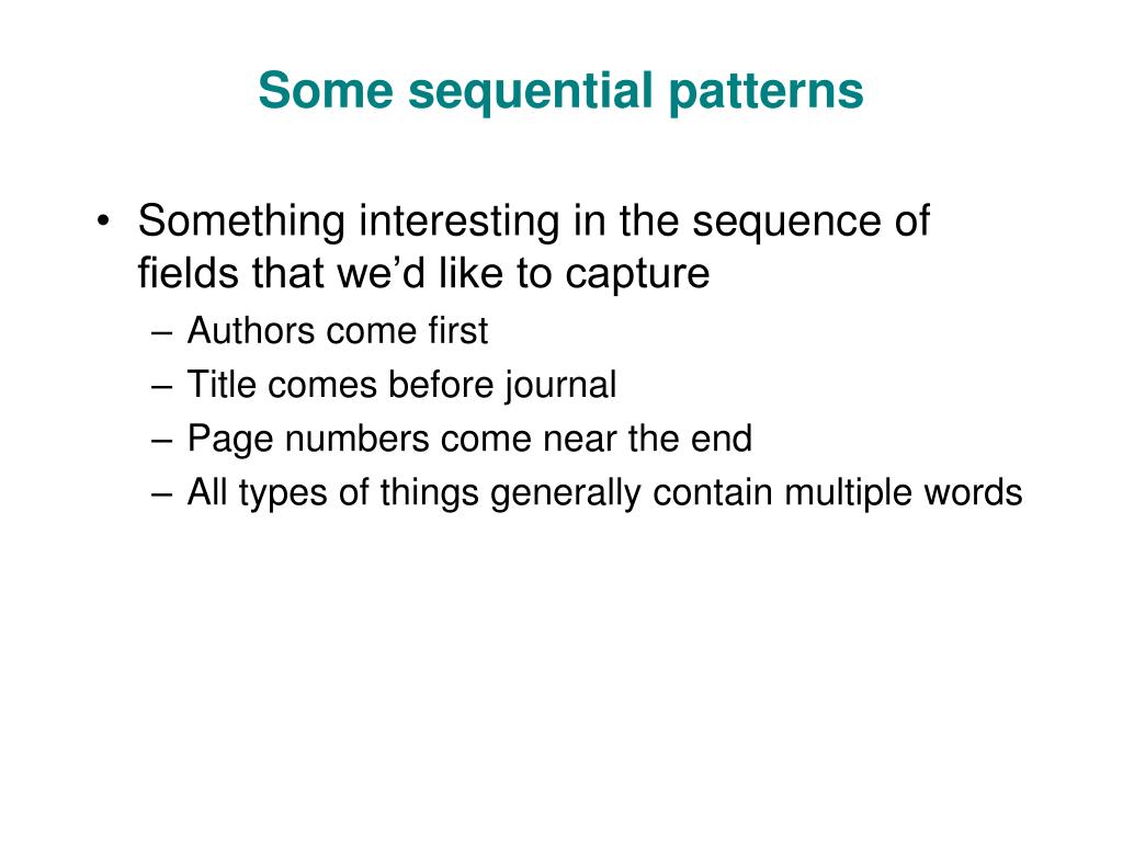 Some sequential patterns • Something interesting in the sequence of fields that we’d like to capture • Authors come first • Title comes before journal • Page numbers come near the end • All types of things generally contain multiple words