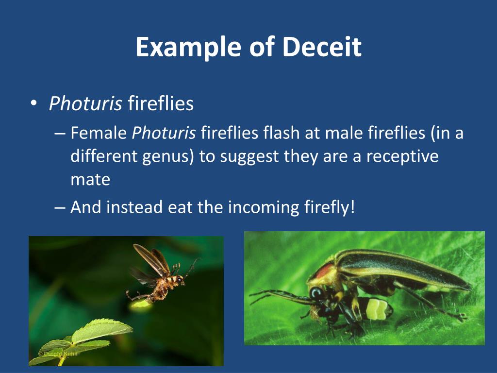 Example of Deceit • Photuris fireflies • Female Photuris fireflies flash at male fireflies (in a different genus) to suggest they are a receptive mate • And instead eat the incoming firefly!