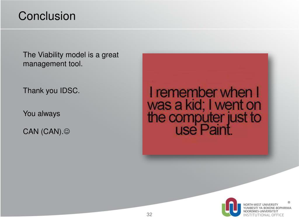 Conclusion The Viability model is a great management tool. Thank you IDSC. You always CAN (CAN).