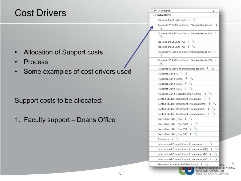 Cost Drivers • Allocation of Support costs • Process • Some examples of cost drivers used Support costs to be allocated: 1. Faculty support – Deans Office