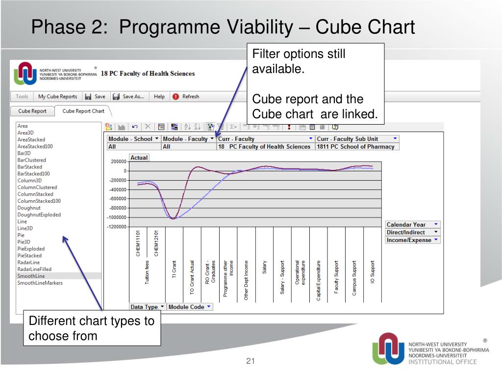 Phase 2: ProgrammeViability – Cube Chart Filter options still available. Cube report and the Cube chart are linked. Different chart types to choose from