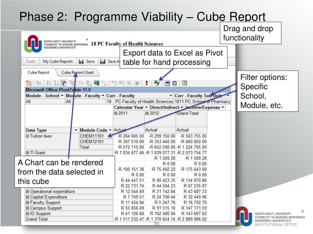 Phase 2: ProgrammeViability – Cube Report Drag and drop functionality Export data to Excel as Pivot table for hand processing Filter options: Specific School, Module, etc. A Chart can be rendered from the data selected in this cube