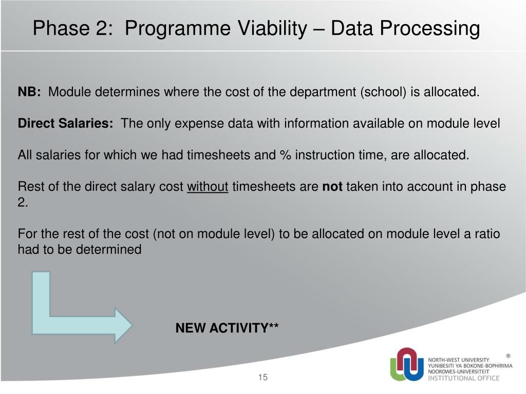 Phase 2: Programme Viability – Data Processing NB: Module determines where the cost of the department (school) is allocated. Direct Salaries: The only expense data with information available on module level All salaries for which we had timesheets and % instruction time, are allocated. Rest of the direct salary cost without timesheets are not taken into account in phase 2. For the rest of the cost (not on module level) to be allocated on module level a ratio had to be determined NEW ACTIVITY**