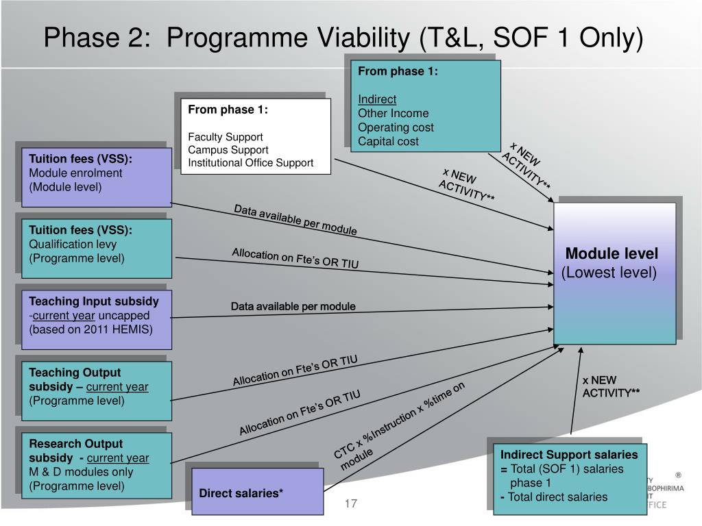 Phase 2: Programme Viability (T&L, SOF 1 Only) From phase 1: Indirect Other Income Operating cost Capital cost From phase 1: Faculty Support Campus Support Institutional Office Support Tuition fees (VSS): Module enrolment (Module level) x NEW ACTIVITY** x NEW ACTIVITY** Modulelevel (Lowest level) Data available per module Tuition fees (VSS): Qualification levy (Programme level) Allocation on Fte’s OR TIU Teaching Input subsidy -current yearuncapped (based on 2011 HEMIS) Data available per module Allocation on Fte’s OR TIU Teaching Output subsidy – current year (Programme level) x NEW ACTIVITY** Allocation on Fte’s OR TIU CTC x %Instruction x %time on module Research Output subsidy - current year M & D modules only (Programme level) Indirect Support salaries = Total (SOF 1) salaries phase 1 - Total direct salaries Direct salaries*